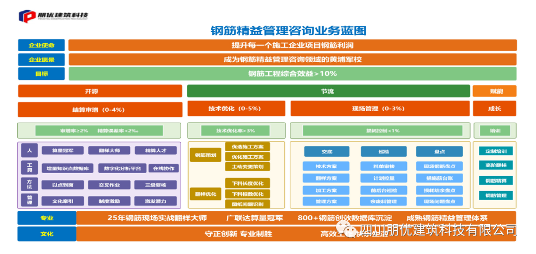 四川朋优建筑科技有限公司专注于钢筋精益管理咨询,提供钢筋技术优化、结算审增、钢筋全过程精细化管理咨询、钢筋精细化施工、钢筋培训、废料回收等专业技术服务,通过专业技术能力+企业数字化能力,助力每一个施工企业钢筋工程利润提升、人员能力提升、精细化管理能力提升。